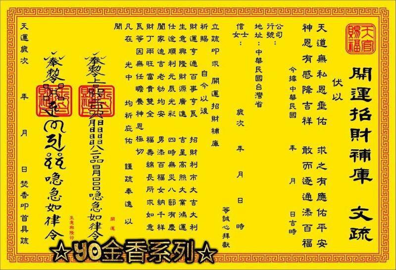 以下為範例:老天爺在上,弟子/信女OOO農曆生辰00年00月00日00時,今日農曆00年00月00日,呼請OO宮OOOO神尊及兵將,協助弟子/信女今日補財庫,元寶數量為00顆,祈求…….。