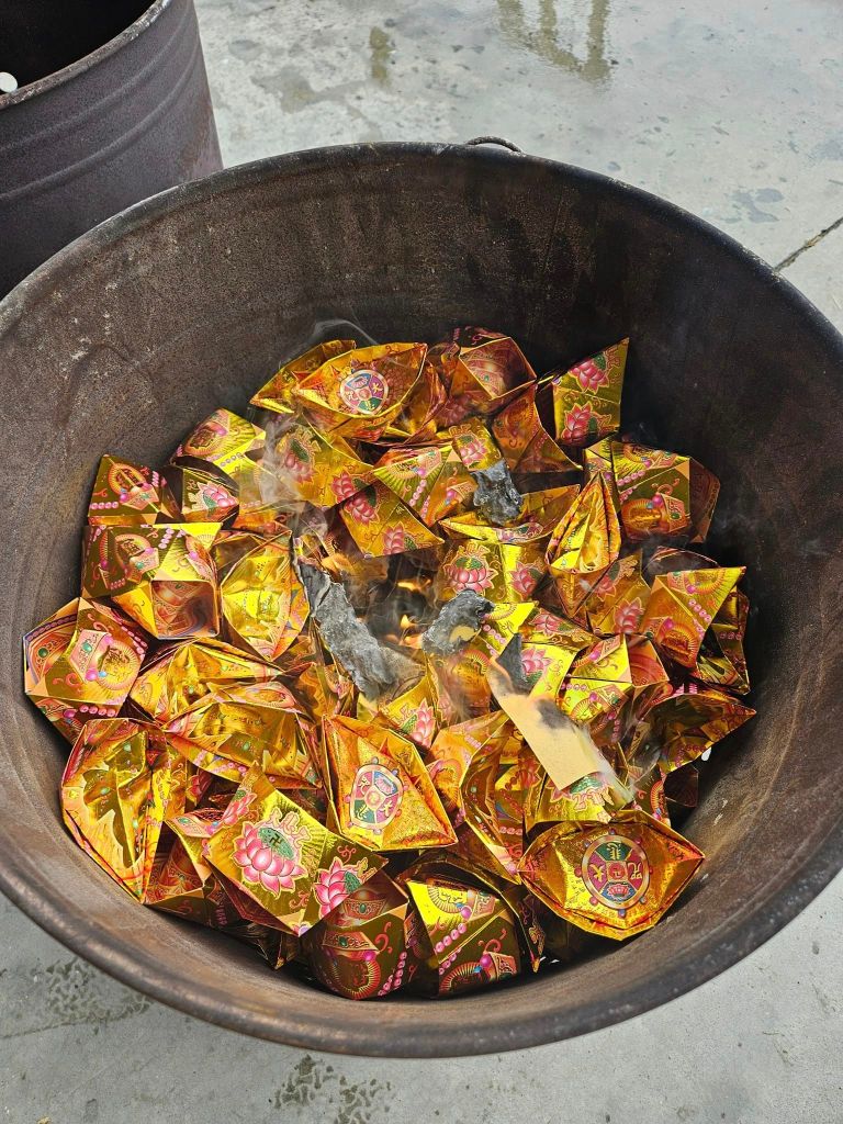 每個月逢農曆初二、十六,總能看到自營業者忙裡忙外忙碌拜拜事宜,準備各種供品及米酒款待好兄弟祈求生意興隆、一切順利,燒化金紙更是不可缺少的步驟。